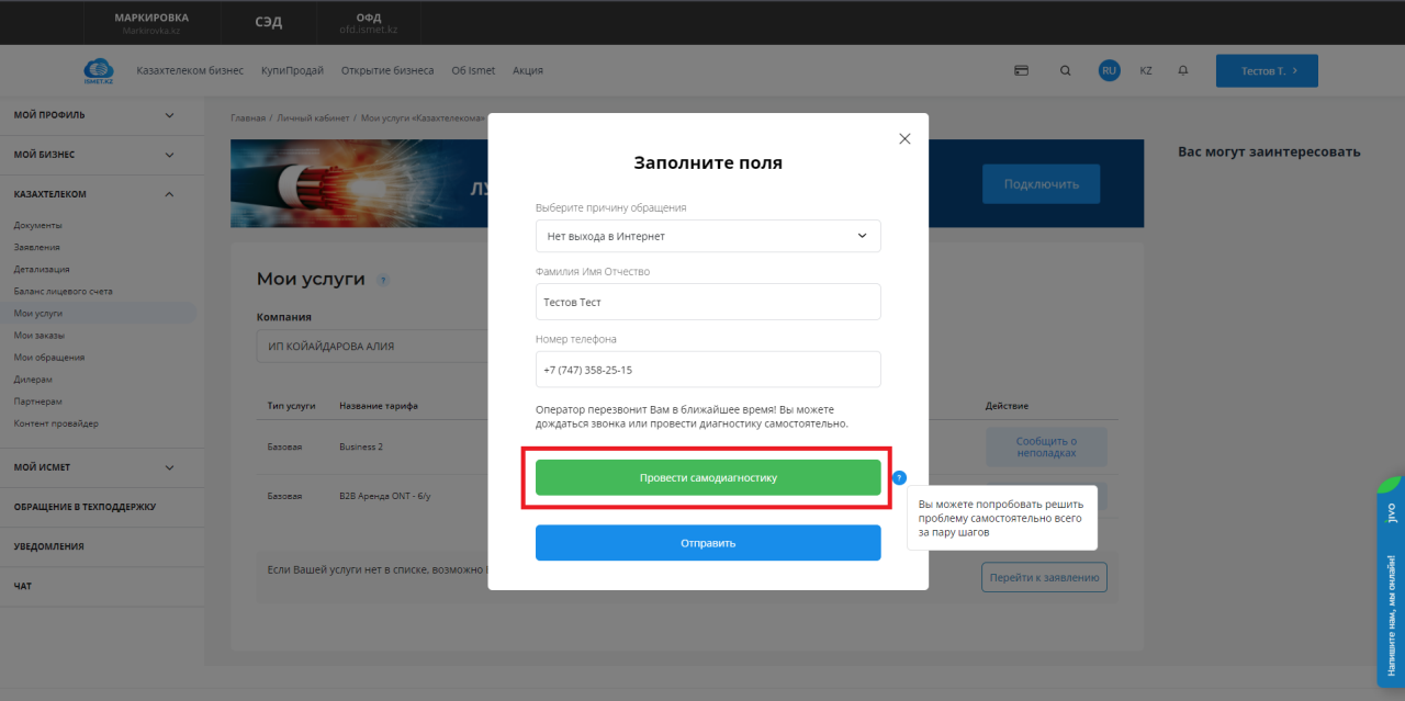 Өзін-өзі диагностикалаудың функционалы "Менің қызметтерім" бөліміндегі Жеке кабинетте кезең-кезеңімен жүзеге асырылады. Пайдаланушы өзіне қажетті тармақтарды таңдай отырып, интернеттегі ақаулықтарды өз бетінше тексеріп, мәселені шеше алады.