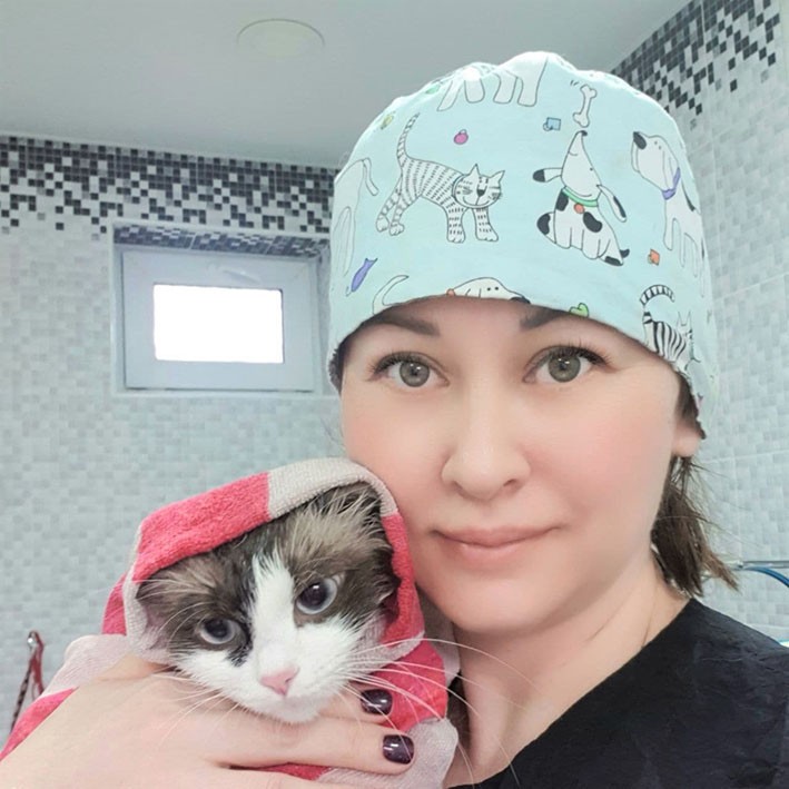 Кейде салонға жүні әбден өсіп, жабысқақ сағыздай ұйысқан, әбіржіп кеткен пациенттер келеді Олардың тұқымын тіпті бірден аңғара алмайсың да. Міне сол кезде менің шығармашылық қасиетім тасып, ұйысқан жүндерін тазалап, тарап, сүп-сүйкімді қалыптарын келтіре аламын. Мен осы мамандықты таңдап, Мәскеу, Самара қалаларындағы груминг Академиясында оқып, білім алдым. Мен ешқашан бұл таңдауыма өкінбедім. Өз басыма рахат пен қуаныш сыйлайтын нағыз сүйікті кәсібімді таптым. Бірақ бұл оңай жұмыс емес.
